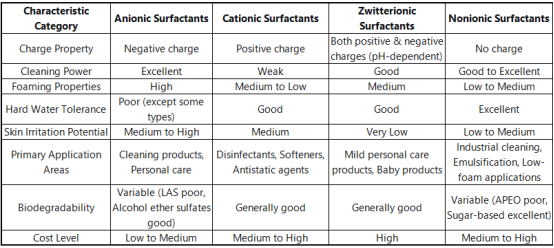 Picking the ideal surfactant needs factor to consider of numerous elements, consisting of application needs, expense, ecological conditions, and governing demands. The complying with table sums up the key attributes of the four primary surfactant classifications: